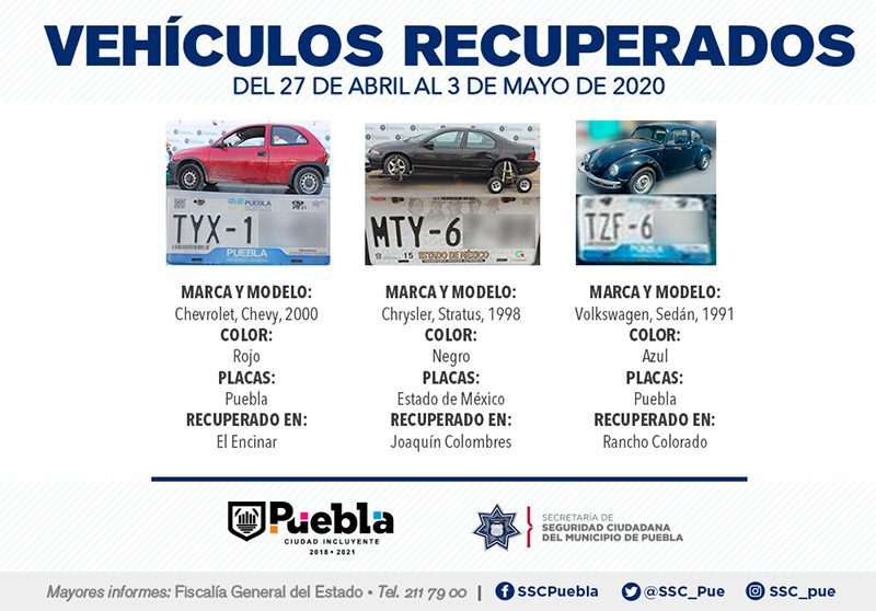 Como parte de los resultados obtenidos mediante el reforzamiento de esquemas de vigilancia en los 271 Vectores de Proximidad que conforman la capital, la Secretaría de Seguridad Ciudadana (SSC) del Municipio de Puebla destacó la recuperación de nueve vehículos con reporte de robo, en el periodo comprendido del 27 de abril al 3 de mayo del presente año.