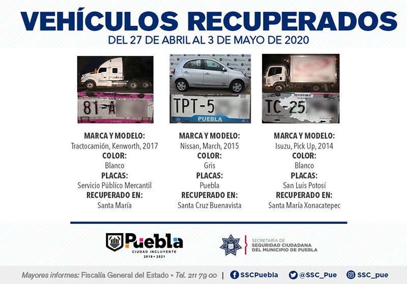 Como parte de los resultados obtenidos mediante el reforzamiento de esquemas de vigilancia en los 271 Vectores de Proximidad que conforman la capital, la Secretaría de Seguridad Ciudadana (SSC) del Municipio de Puebla destacó la recuperación de nueve vehículos con reporte de robo, en el periodo comprendido del 27 de abril al 3 de mayo del presente año.