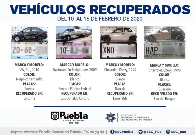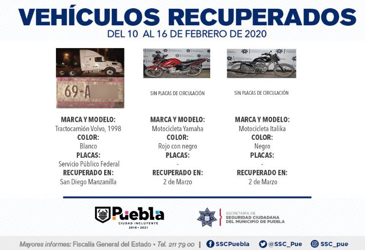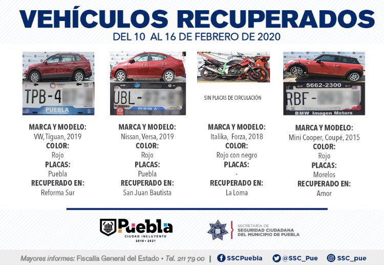 Como resultado de la implementación de recorridos constantes en colonias, unidades habitacionales, barrios y juntas auxiliares, la Secretaría de Seguridad Ciudadana (SSC) del Municipio de Puebla reportó la recuperación de 11 vehículos con reporte de robo, en el periodo que comprende del 10 al 16 de febrero del presente año.