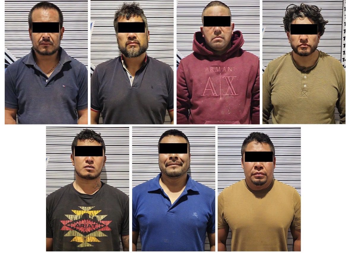 Los detenidos en esta intervención son: Roberto N., alias “El Bukanas”, quien cuenta con orden de aprehensión vigente por el delito de homicidio; Gerardo N., quien cuenta con antecedentes penales por delitos contra la salud y orden de aprehensión vigente por lesiones y robo; Saúl N., alias “El Fósil”, quien cuenta con antecedentes penales por portación de arma de fuego; Efrén N., alias “El Marañón”, quien cuenta con antecedentes por el delito de violación a la ley general de población; Juan Antonio N., alias “Charo”, así como Favián N., y Juan Carlos N.