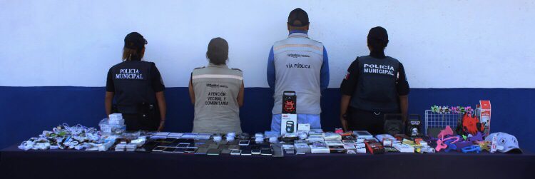 Además, derivado de la coordinación entre autoridades municipales, en inmediaciones de la calle 8 Poniente se logró exitosamente el aseguramiento de más de 30 equipos telefónicos, cuya procedencia se presume ilícita así como, tarjetas SIM y accesorios diversos, los cuales fueron resguardados por la SEGOM para los trámites correspondientes.