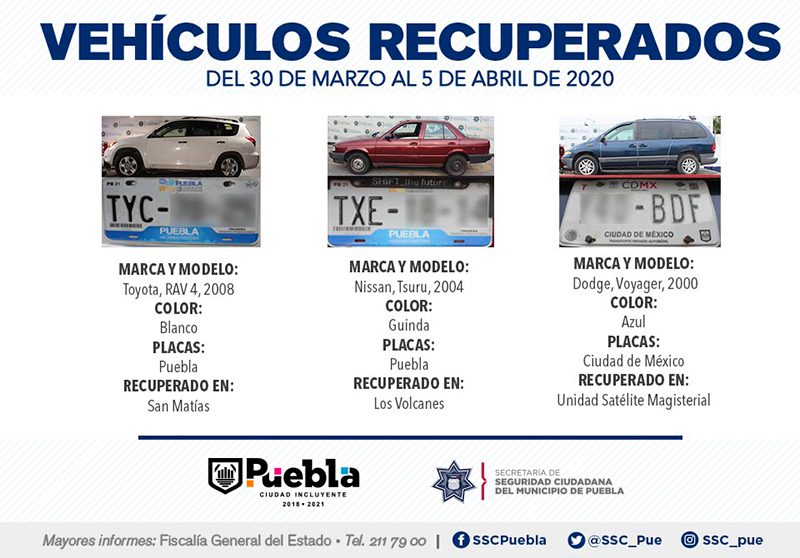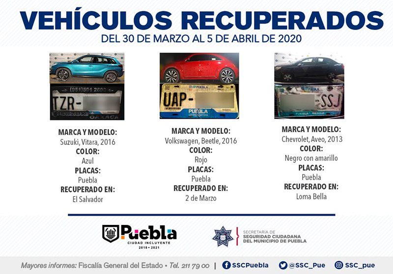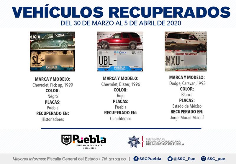 Como resultado de la implementación y mejoramiento de la Estrategia de Vectores de Proximidad, la Secretaría de Seguridad Ciudadana (SSC) del Municipio de Puebla reportó la recuperación de 13 vehículos con reporte de robo, en el periodo que comprende del 30 de marzo al 5 de abril del presente año.