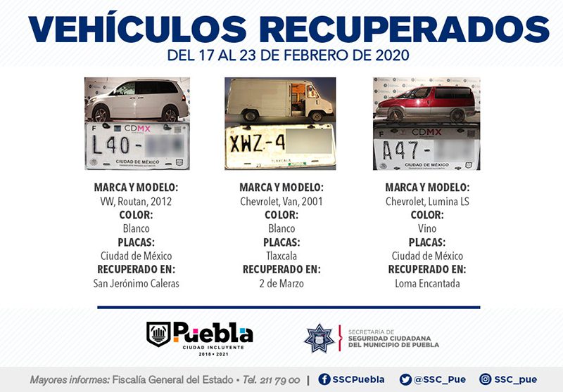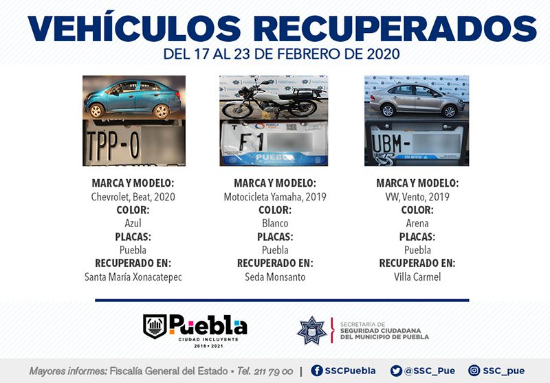 En seguimiento puntual a la implementación de acciones policiales para combatir la comisión de delitos, la Secretaría de Seguridad Ciudadana (SSC) del Municipio de Puebla recuperó nueve vehículos con reporte de robo, en el periodo que comprende del 17 al 23 de febrero del presente año.
