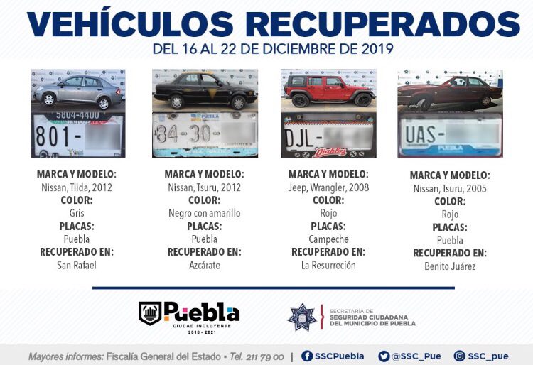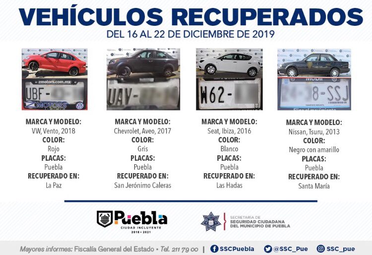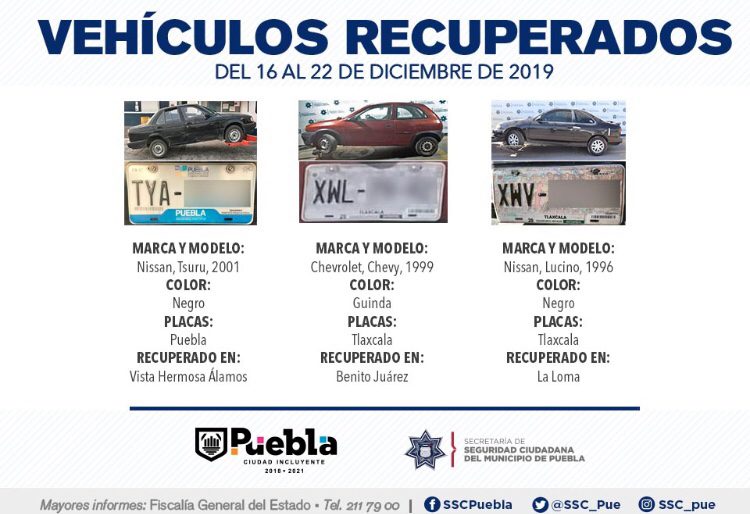 Derivado de la implementación de dispositivos y patrullajes de vigilancia en las nueve zonas operativas que integran la capital, la Secretaría de Seguridad Ciudadana (SSC) de Puebla reportó la recuperación de 11 vehículos con reporte de robo, en el periodo que comprende del 16 al 22 de diciembre del presente año.