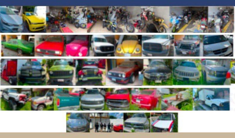 Con base en datos de prueba, se solicitó una orden de cateo en el lugar. Durante la diligencia, se localizó el indicio primordial —el vehículo con reporte de robo— y se realizó el aseguramiento de 28 vehículos (unidades compactas y camionetas), 22 motocicletas, dos remolques y una lancha.