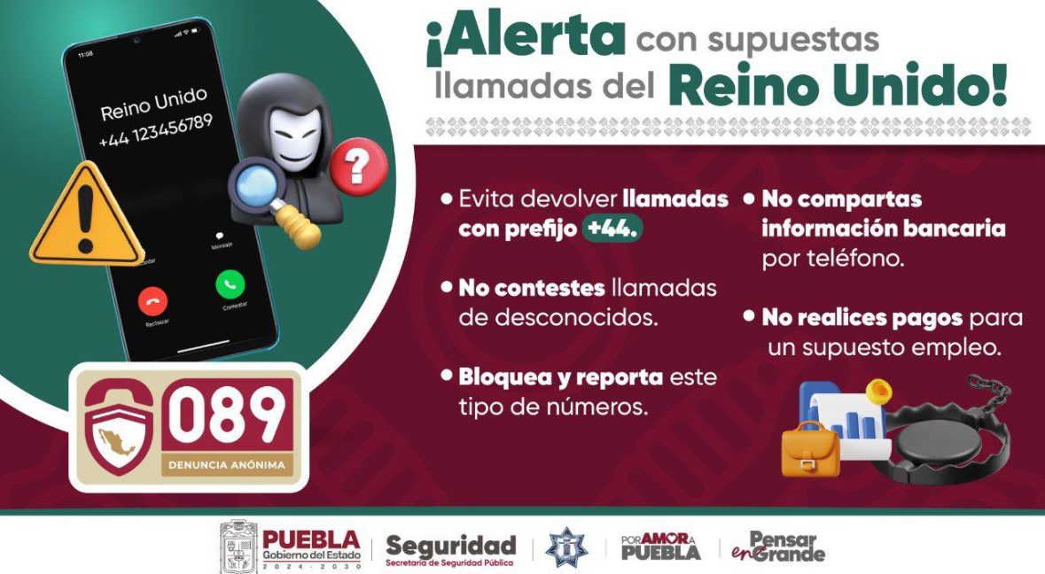 El Gobierno del Estado de Puebla, a través de la Secretaría de Seguridad Pública (SSP), hace un llamado a la ciudadanía a redoblar medidas de autocuidado para evitar ser víctima de la comisión de algún delito debido a las supuestas llamadas telefónicas de números provenientes de Reino Unido.