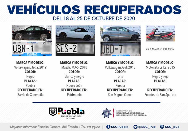 Como resultado del fortalecimiento de la estrategia de combate a la delincuencia, la Secretaría de Seguridad Ciudadana (SSC) del Municipio de Puebla reportó la recuperación de ocho vehículos con reporte de robo, en el periodo comprendido del 18 al 25 de octubre de 2020.