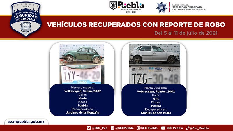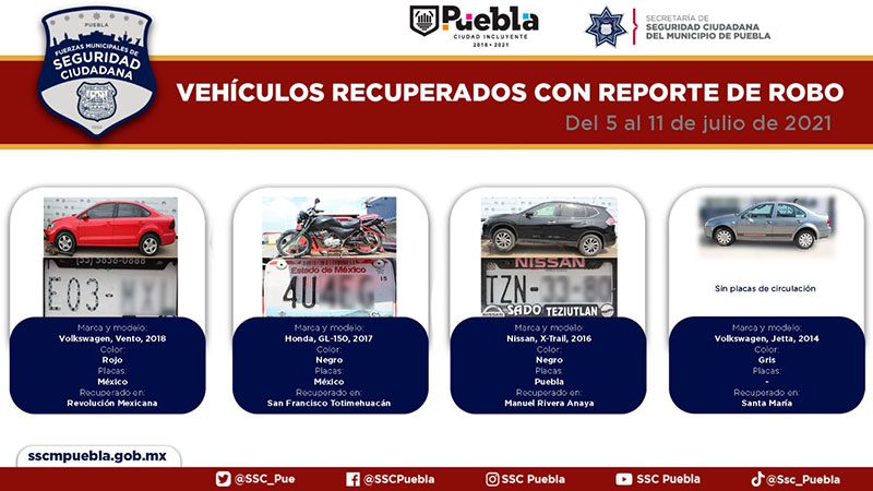 Derivado del fortalecimiento de acciones de vigilancia y reacción policial, la Secretaría de Seguridad Ciudadana (SSC) del Municipio de Puebla reportó la recuperación de 13 vehículos con reporte de robo, en el periodo comprendido del 5 al 11 de julio del presente año.