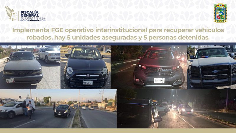 La Fiscalía General del Estado de Puebla implementó un operativo interinstitucional con la Secretaría de Seguridad Ciudadana del municipio Puebla (SSC), para localizar vehículos con reporte de robo en la ciudad de Puebla, el cual permitió el aseguramiento de cinco vehículos y la detención de cinco personas.