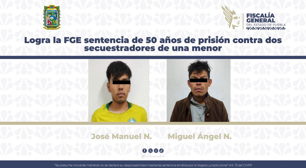 La Fiscalía General del Estado de Puebla informa que derivado de un sólido trabajo de investigación, se obtuvo una sentencia de 50 años de prisión en contra de José Manuel N., de 19 años y de Miguel Ángel N., de 24 años, declarados penalmente responsables del delito de secuestro agravado, cometido en 2023, en la ciudad de Puebla.