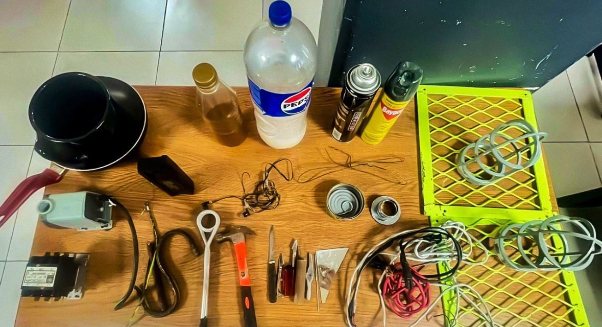 También se decomisó varilla, cables, envases con líquido fermentado, entre otros objetos de metal y plástico.