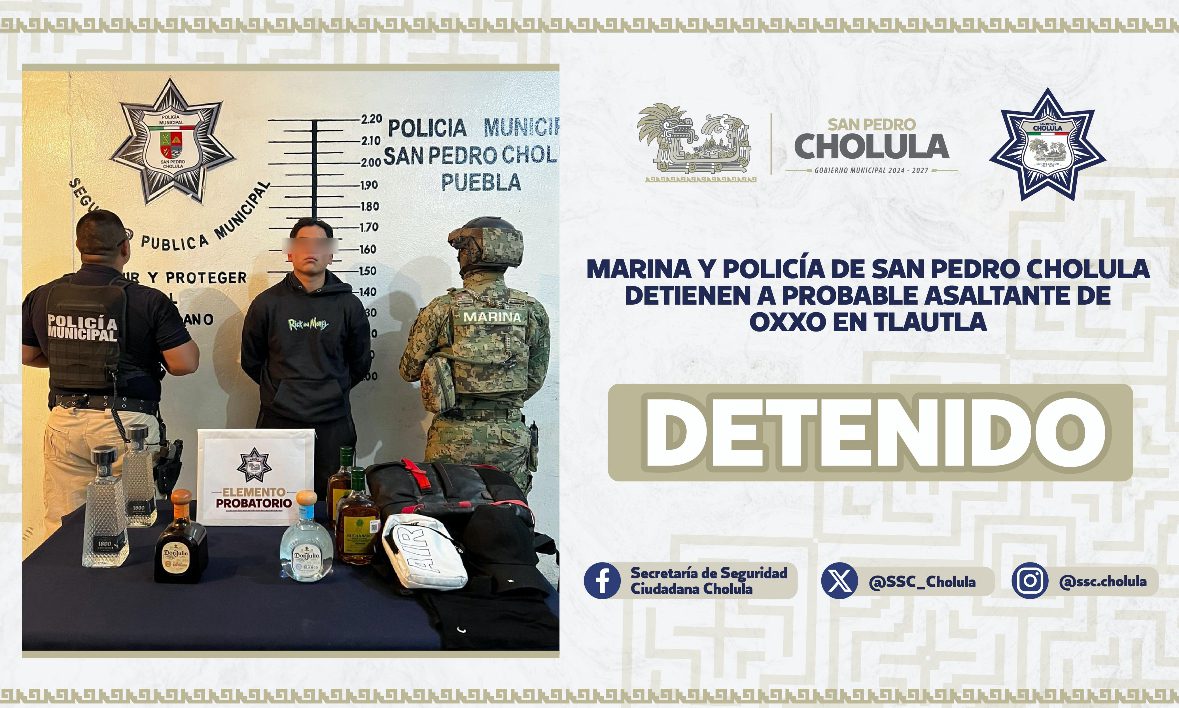 Elementos de la Secretaría de Marina (SEMAR) y policías de la Secretaría de Seguridad Ciudadana de San Pedro Cholula (SSC Cholula), detuvieron a Jeshua “N” de 19 años, por su probable participación en el robo a un OXXO, ubicado en la Junta Auxiliar de San Juan Tlautla.