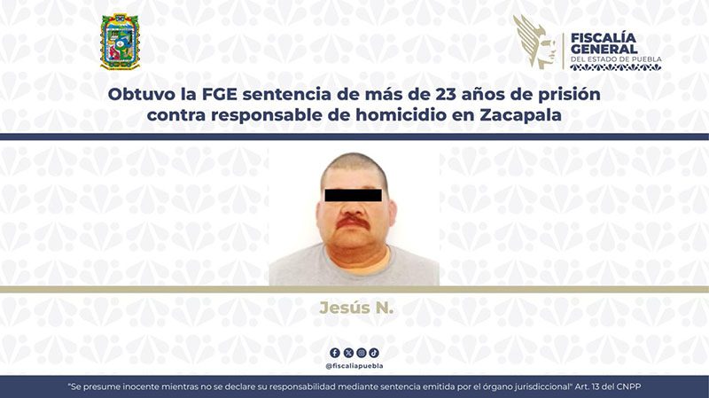 La Fiscalía General del Estado logró una condena de más de 23 años de prisión contra Jesús N., de 60 años de edad, penalmente responsable del homicidio de un hombre registrado en el municipio de Zacapala, Puebla.