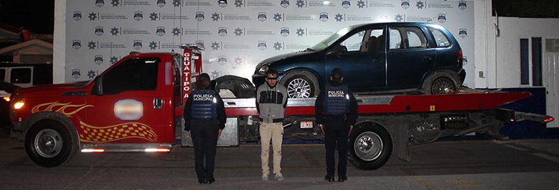 Policías Municipales de la Región Norte, Zona Uno, circulaban sobre la Carretera Federal Puebla – Tlaxcala, cuando se percataron que un ciudadano pidió apoyo para detener a un hombre, ya que momentos antes le robó una grúa y un automóvil marca Chevrolet, tipo Chevy, color azul, mismo que se encontraba sobre la plataforma de la primera unidad.