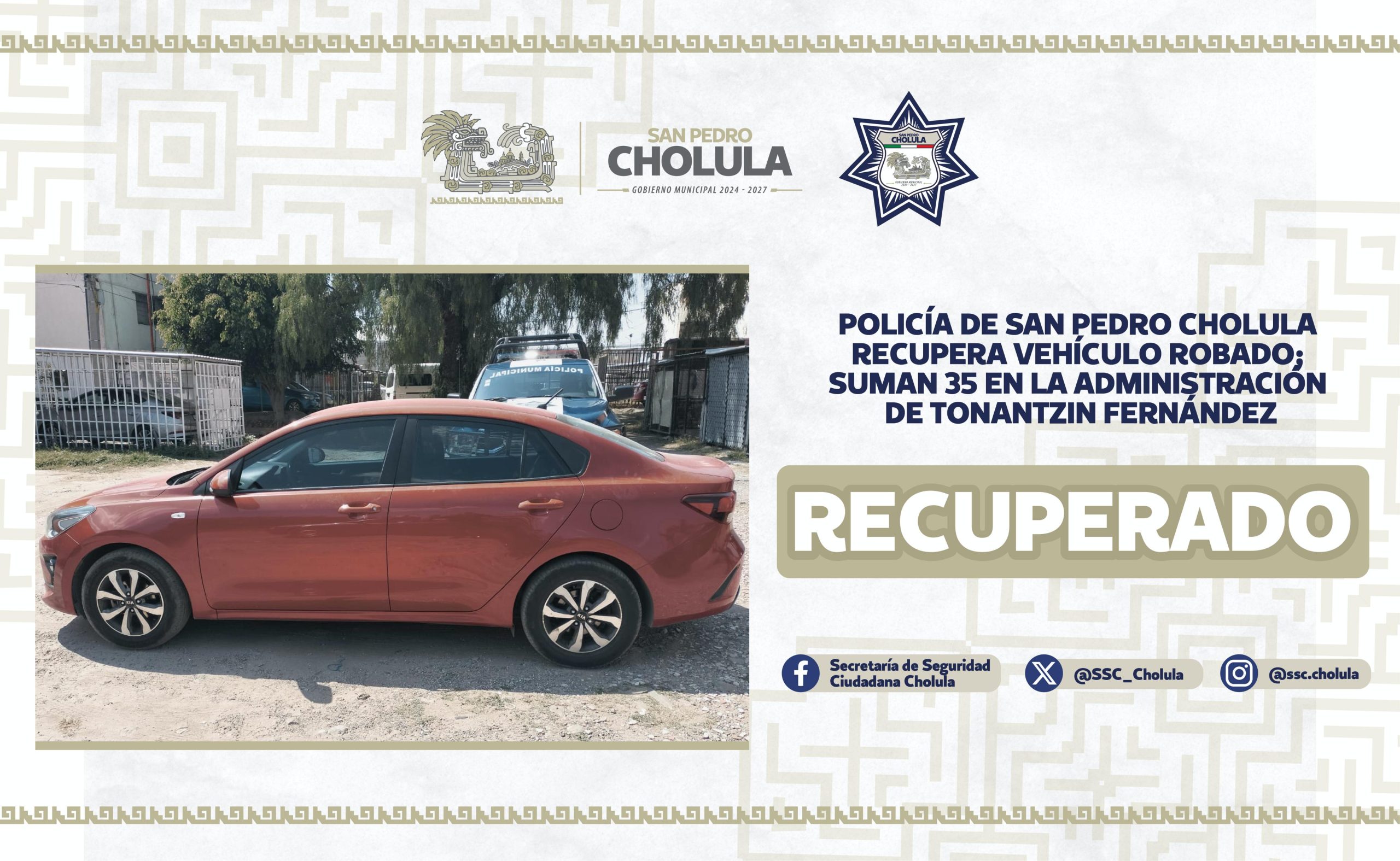 Como resultado de diversas estrategias implementadas para localizar vehículos con reporte de robo en San Pedro Cholula, la Secretaría de Seguridad Ciudadana (SSC Cholula), ha recuperado un total de 35 automóviles, en el periodo que comprende de octubre de 2024 a marzo de 2025, aunado a ello, 12 personas han sido detenidas por su probable participación en hechos con apariencia de delito relacionados a estos casos.