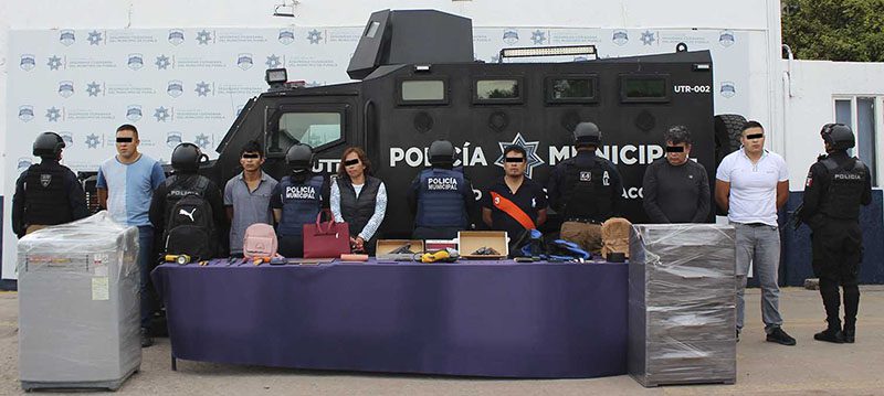 Enseguida, se implementó un operativo de seguimiento a cargo de la Unidad Táctica de Reacción (UTR), Unidad Canina y Grupo Águilas que permitió la detención del vehículo y siete ocupantes en inmediaciones de la calle Morelos, del Municipio de Cuautlancingo. En la acción, se recuperaron una lavadora, esquineros, bolsos, billeteras, monederos, herramienta para construcción, joyería y bisutería. Además, se aseguraron dos armas de fuego tipo escuadra y revólver, respectivamente.