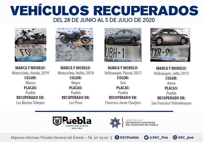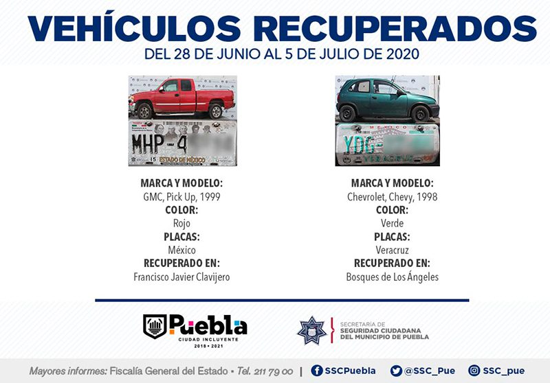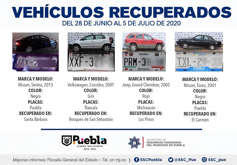 En seguimiento puntual al robustecimiento de la Estrategia de Vectores de Proximidad, a fin de inhibir la comisión de hechos delictivos en la capital, la Secretaría de Seguridad Ciudadana (SSC) del Municipio de Puebla reportó la recuperación de 11 vehículos con reporte de robo, en el periodo que comprende del 28 de junio al 5 de julio del presente año.