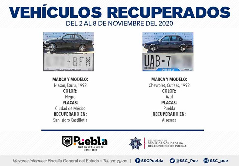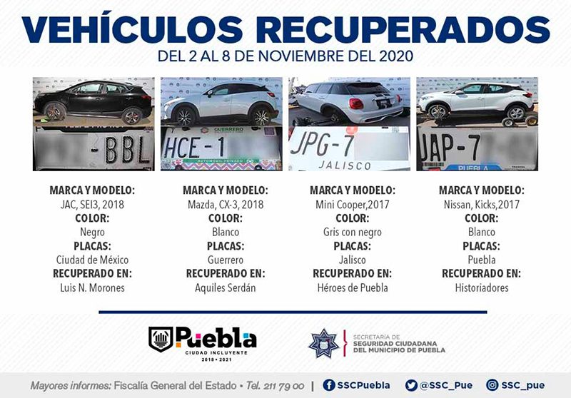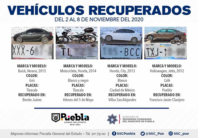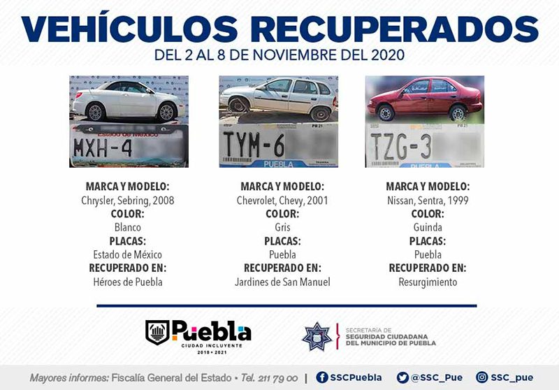 Derivado del fortalecimiento de esquemas de vigilancia en los 271 Vectores de Proximidad que conforman la capital, la Secretaría de Seguridad Ciudadana (SSC) del Municipio de Puebla reportó la recuperación de 14 vehículos con reporte de robo, en el periodo comprendido del 2 al 8 de noviembre del 2020.