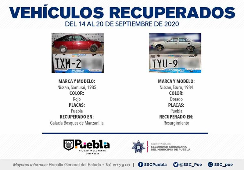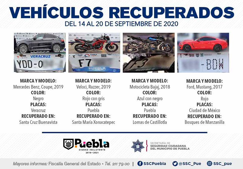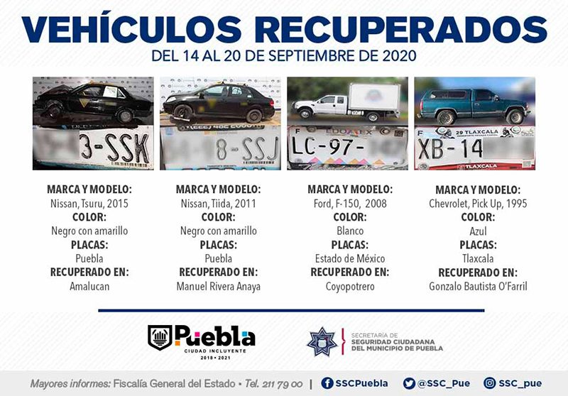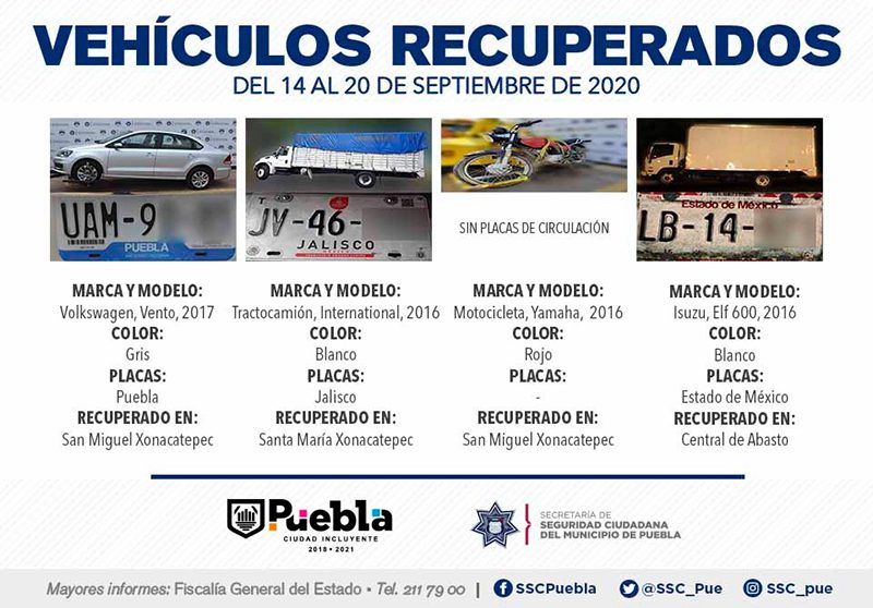 Derivado del constante fortalecimiento de la estrategia de Vectores de Proximidad, la Secretaría de Seguridad Ciudadana (SSC) del Municipio de Puebla anunció la recuperación de 14 vehículos con reporte de robo, en el periodo comprendido del 14 al 20 de septiembre del presente año.