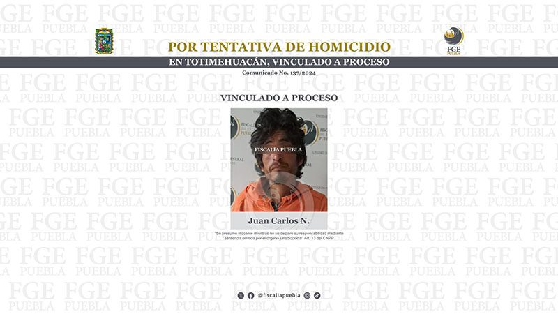 Durante audiencia, la Fiscalía General del Estado de Puebla logró que se dictara auto de vinculación a proceso contra Juan Carlos N., por el delito de homicidio calificado en grado de tentativa.
