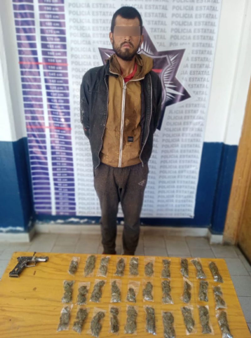 El hombre, de 22 años, viajaba a bordo de una motocicleta Italika sin placas de circulación; tras una revisión a sus pertenencias, los agentes aseguraron una arma de fuego hechiza tipo escuadra con un cartucho útil, así como 30 envoltorios con aparente marihuana.