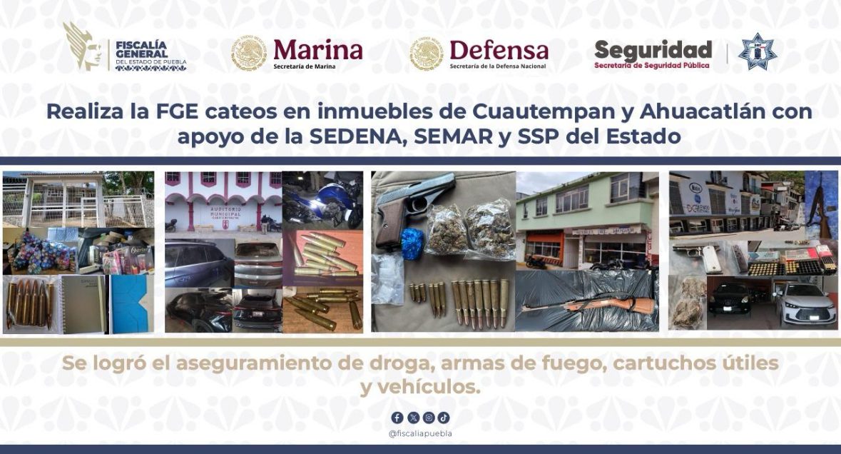 La Fiscalía General del Estado de Puebla, con apoyo de las Secretarías de la Defensa Nacional (SEDENA), Marina (SEMAR) y Seguridad Pública del Estado (SSP), cateó diversos inmuebles en los municipios de Cuautempan y Ahuacatlán, donde se logró el aseguramiento de droga, armas de fuego, cartuchos útiles y vehículos.