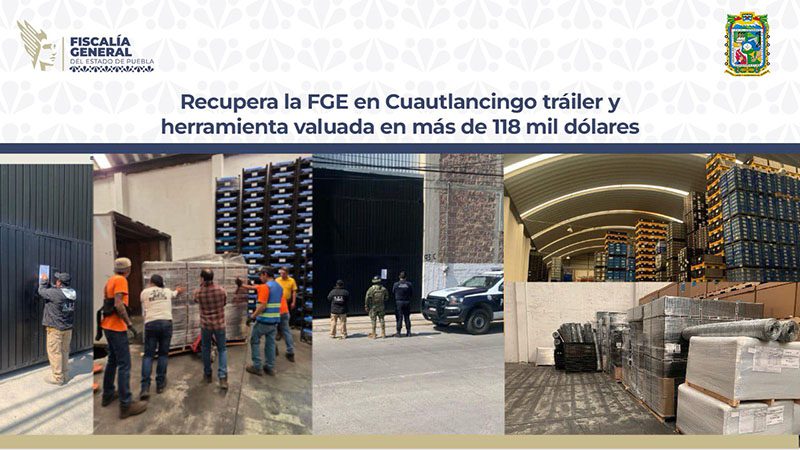 La Fiscalía General del Estado recuperó en Cuautlancingo, Puebla, con apoyo de elementos de las Secretarías de Marina, Seguridad Pública Estatal y Policía Municipal, un tráiler y un cargamento de herramienta con valor de más de 118 mil dólares.