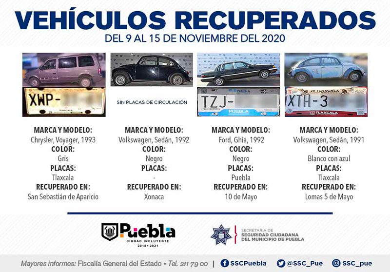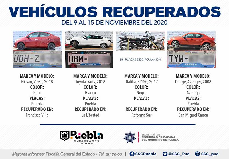 En seguimiento puntual al robustecimiento de esquemas preventivos y de reacción operativa, la Secretaría de Seguridad Ciudadana (SSC) del Municipio de Puebla anunció la recuperación de ocho vehículos con reporte de robo, en el periodo comprendido del 9 al 15 de noviembre del presente año.