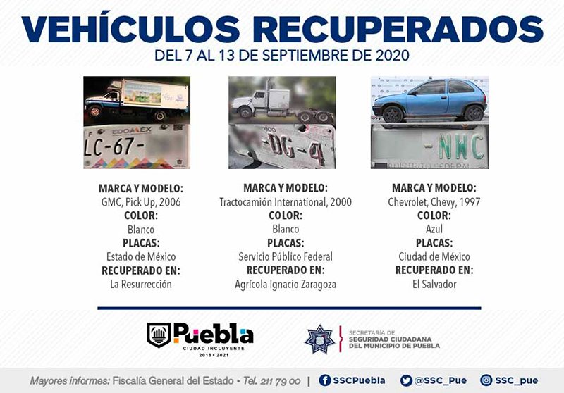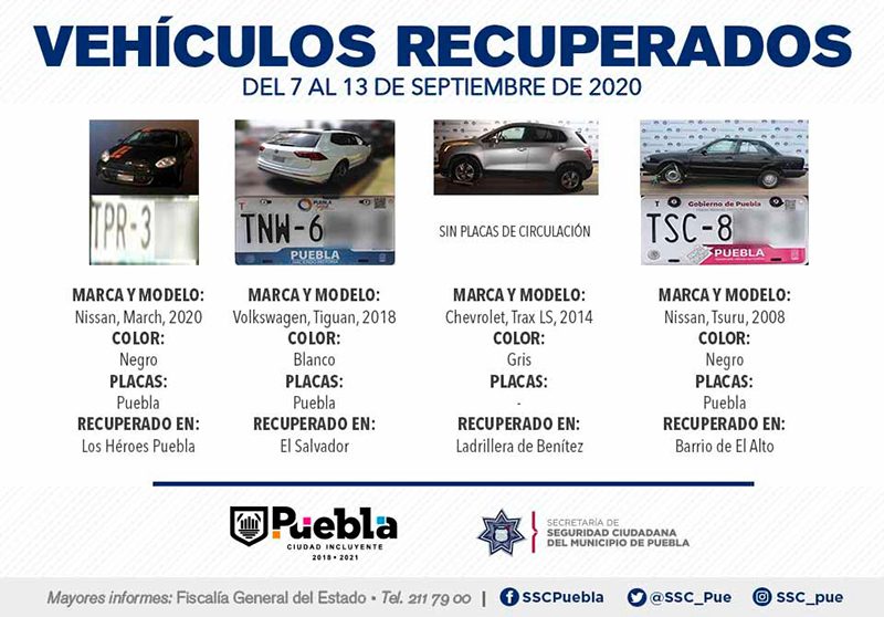 Derivado de la implementación de esquemas de vigilancia en colonias, unidades habitaciones, barrios y las 17 juntas auxiliares que conforman la capital, la Secretaría de Seguridad Ciudadana (SSC) de Puebla ubicó y recuperó ocho vehículos con reporte de robo, en el periodo que comprende del 7 al 13 de septiembre del año en curso.