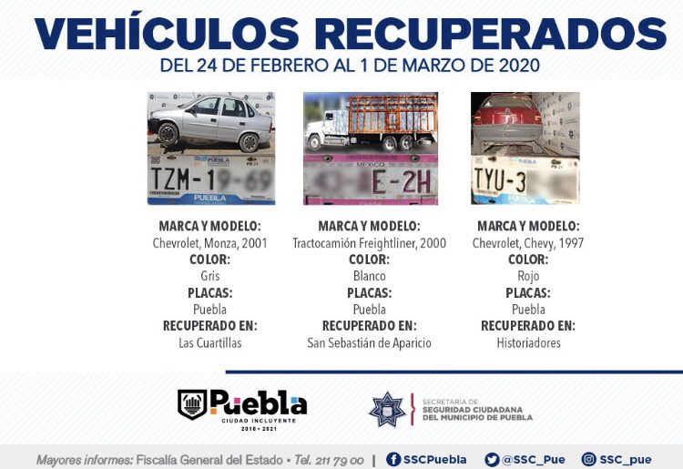 La Secretaría de Seguridad Ciudadana (SSC) del Municipio de Puebla reportó la recuperación de siete vehículos con reporte de robo, en el periodo que comprende del 24 de febrero al 1 de marzo del presente año.