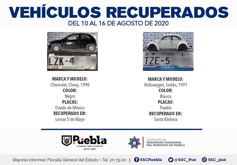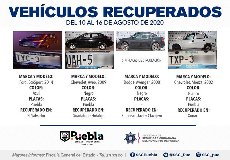 La Secretaría de Seguridad Ciudadana (SSC) del Municipio de Puebla reportó la recuperación de diez vehículos con reporte de robo, en el periodo comprendido del 10 al 16 de agosto del presente año.