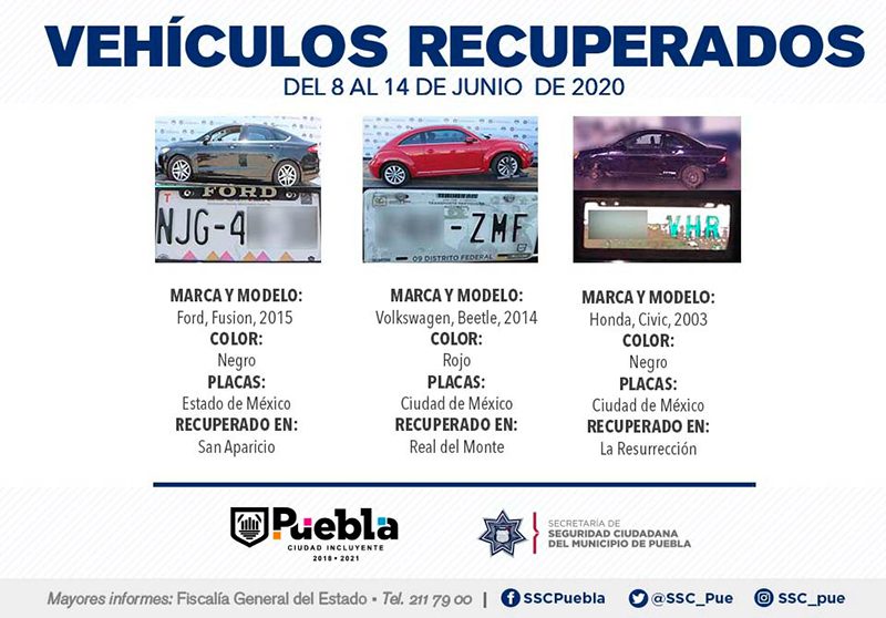 Como resultado de la implementación constante de patrullajes de vigilancia en los 271 Vectores de proximidad que conforman la capital del Estado, la Secretaría de Seguridad Ciudadana (SSC) del Municipio de Puebla reportó la recuperación de siete vehículos con reporte de robo, en el periodo que comprende del 8 al 14 de junio del presente año.