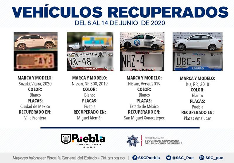 Como resultado de la implementación constante de patrullajes de vigilancia en los 271 Vectores de proximidad que conforman la capital del Estado, la Secretaría de Seguridad Ciudadana (SSC) del Municipio de Puebla reportó la recuperación de siete vehículos con reporte de robo, en el periodo que comprende del 8 al 14 de junio del presente año.