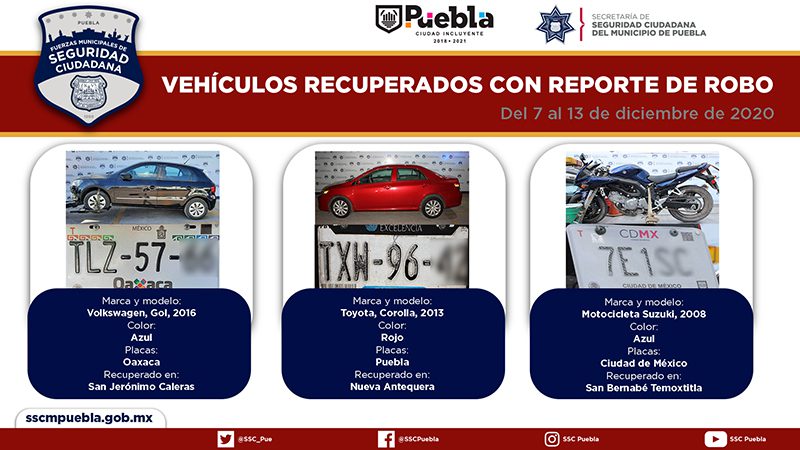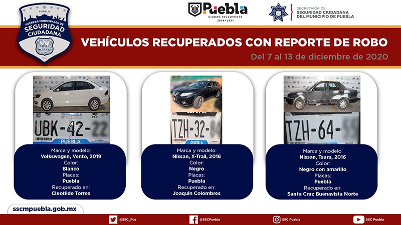 Derivado de la implementación de esquemas de vigilancia en las Regiones Norte, Centro, Sur y Subzona Centro Histórico de la capital, el Gobierno de la Ciudad de Puebla que encabeza la alcaldesa Claudia Rivera Vivanco, a través de la Secretaría de Seguridad Ciudadana (SSC) del Municipio reportó la recuperación de 11 vehículos con reporte de robo, en el periodo comprendido del 7 al 13 de diciembre del presente año.