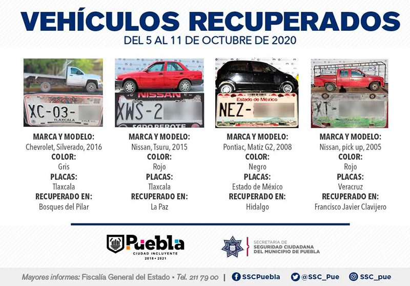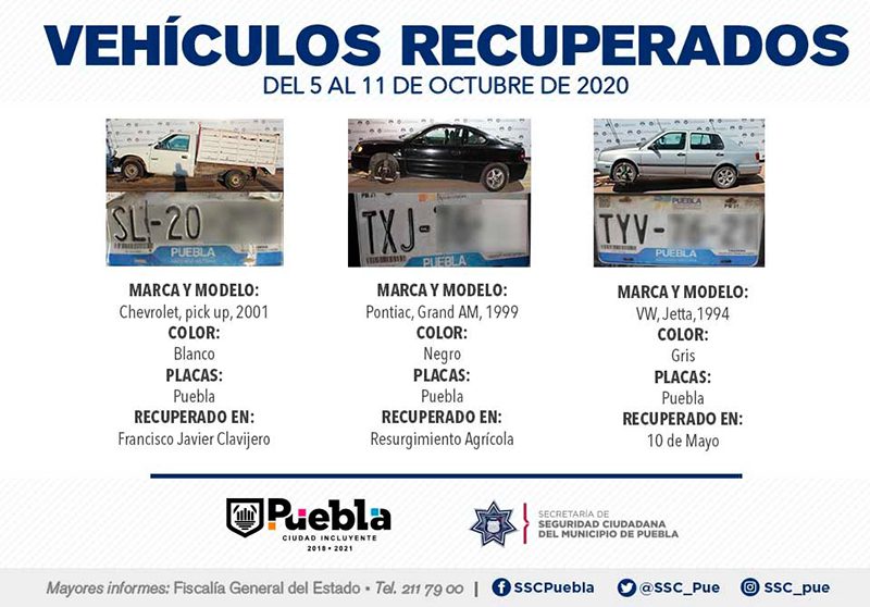 Derivado de la implementación de acciones preventivas y de reacción policial, la Secretaría de Seguridad Ciudadana (SSC) del Municipio de Puebla reportó la recuperación de 11 vehículos con reporte de robo, en el periodo comprendido del 5 al 11 de octubre del presente año.