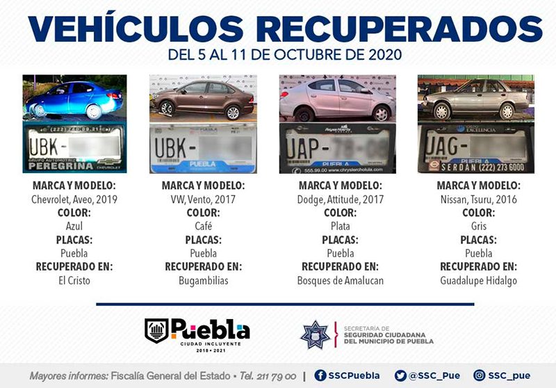 Derivado de la implementación de acciones preventivas y de reacción policial, la Secretaría de Seguridad Ciudadana (SSC) del Municipio de Puebla reportó la recuperación de 11 vehículos con reporte de robo, en el periodo comprendido del 5 al 11 de octubre del presente año.
