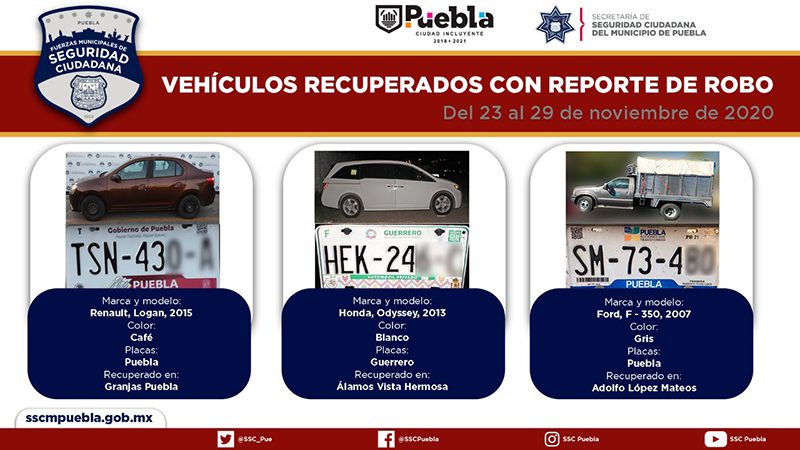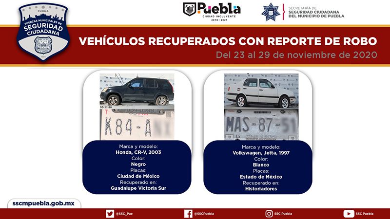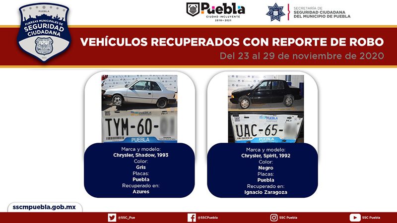 En seguimiento puntual a la implementación de acciones para combatir la comisión de conductas delictivas en Puebla, una Ciudad Incluyente, la Secretaría de Seguridad Ciudadana (SSC) del Municipio reportó la recuperación de 10 vehículos con reporte de robo, en el periodo comprendido del 23 al 29 de noviembre del año en curso.