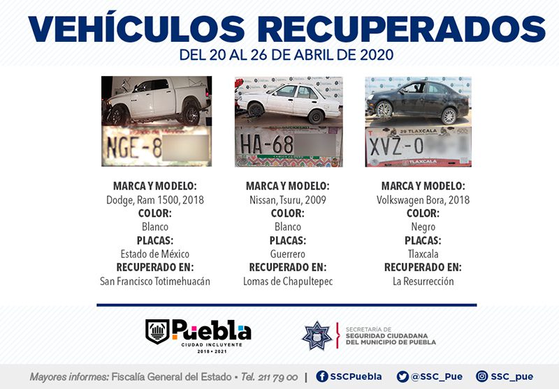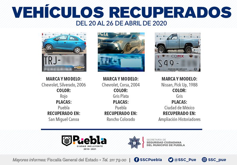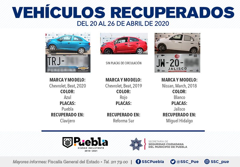 Derivado del robustecimiento de acciones de prevención del delito, la Secretaría de Seguridad Ciudadana (SSC) del Municipio de Puebla destacó la recuperación de nueve vehículos con reporte de robo, en el periodo que comprende del 20 al 26 de abril del presente año.