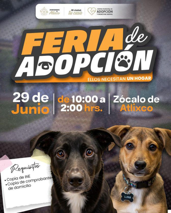 La presidenta municipal de Atlixco, Ariadna Ayala, invita a la Feria de Adopción Canina que se llevará a cabo en el Zócalo de Atlixco este domingo 29 de junio de 10:00 a 14:00 horas.