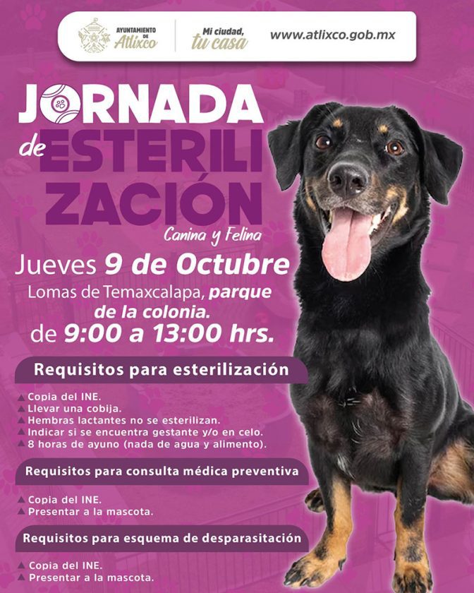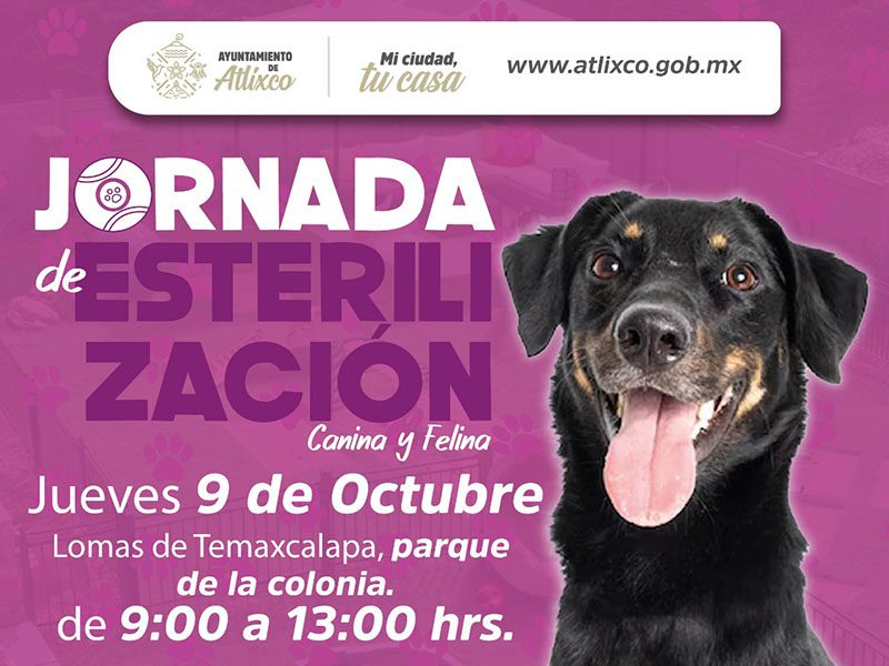 El Ayuntamiento de Atlixco, encabezado por la presidenta Ariadna Ayala, invita a la ciudadanía a participar en las Jornadas Gratuitas de Esterilización y Atención Médica Animal, una iniciativa que promueve la tenencia responsable y el bienestar de los animales de compañía, pilares fundamentales de una sociedad más empática y consciente.