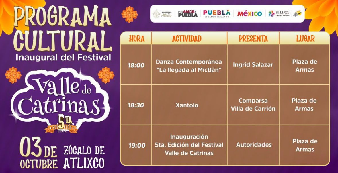 Ariadna Ayala, presidenta de Atlixco, invita a familias y visitantes a la inauguración de la 5ª edición del Festival Internacional Valle de Catrinas este viernes 3 de octubre a las siete de la tarde en el Zócalo.