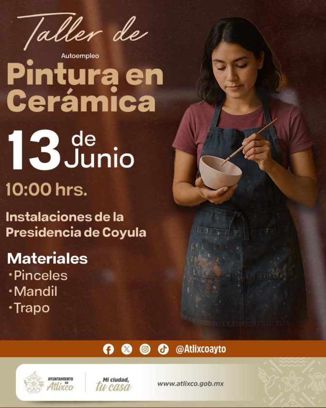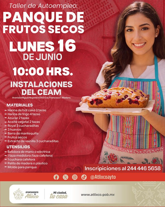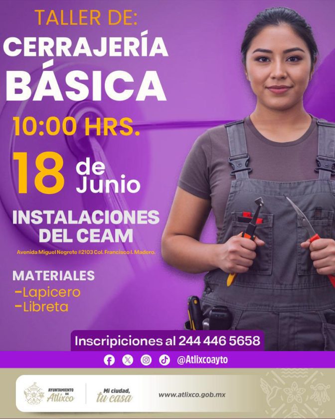 Los talleres son totalmente gratuitos. Las interesadas pueden comunicarse al 244 446 5658 para conocer los requisitos, materiales necesarios y consultar fechas y sedes a través de las redes sociales del Ayuntamiento de Atlixco.