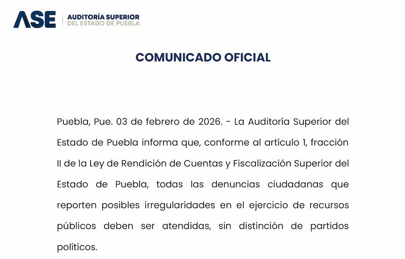 A través de un comunicado, el organismo fiscalizador precisó que, de acuerdo con la Ley de Rendición de Cuentas y Fiscalización Superior del Estado de Puebla, tiene la obligación de atender cualquier reporte ciudadano que señale el posible mal uso de recursos públicos.