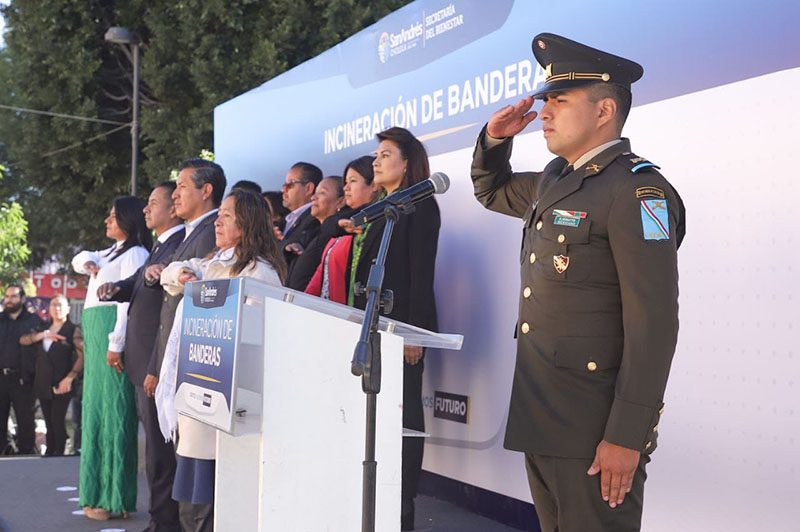 El presidente municipal Mundo Tlatehui encabezó la ceremonia de incineración de banderas con la participación de 14 escuelas del municipio de San Andrés Cholula.
