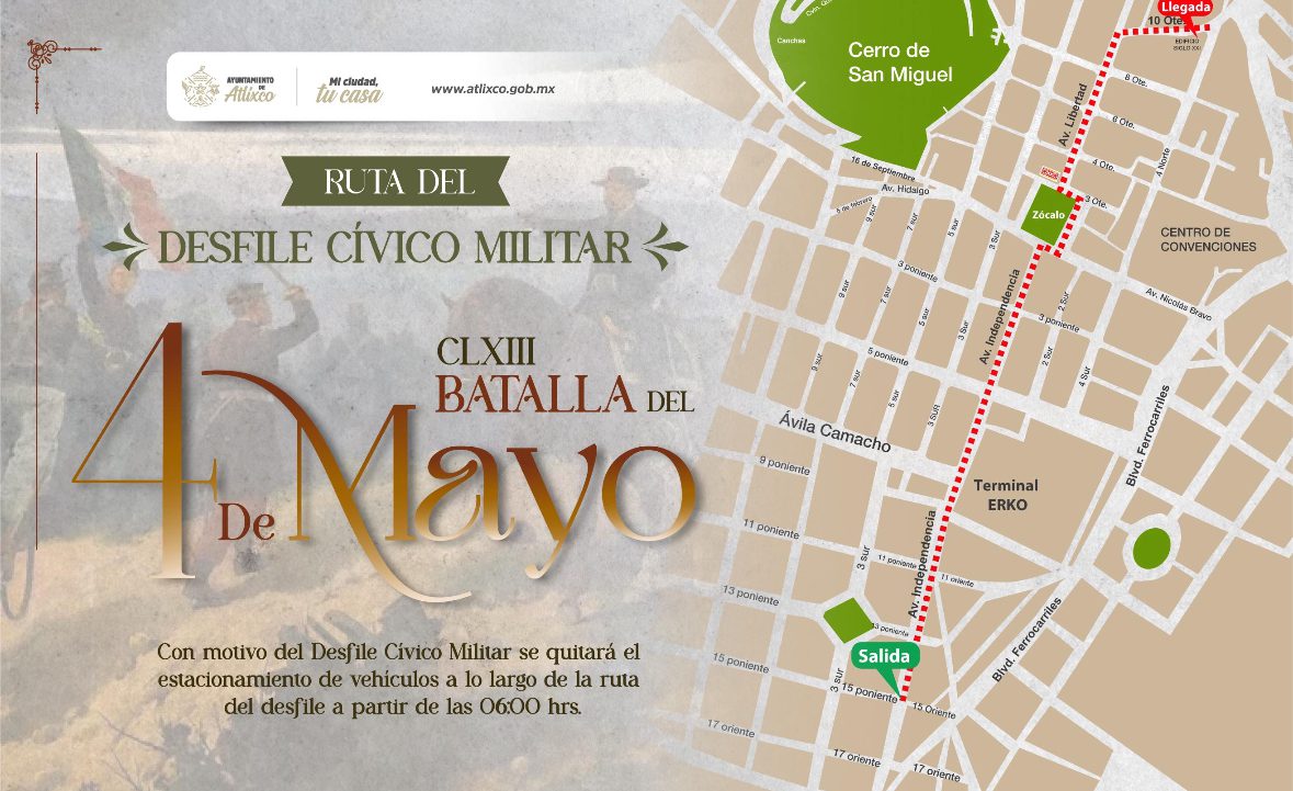 Las celebraciones comenzarán a las 8:00 de la mañana con una ceremonia cívica en las inmediaciones de la Ex Hacienda La Trapera; posteriormente a las 9:00 horas, el tradicional Desfile Cívico-Militar recorrerá las principales calles de la ciudad, llenándolas de color y patriotismo, finalizando a la 12:30 con el Conversatorio Atlixco y la CLXIII Batalla del 4 de Mayo: Sus Protagonistas y Condiciones.