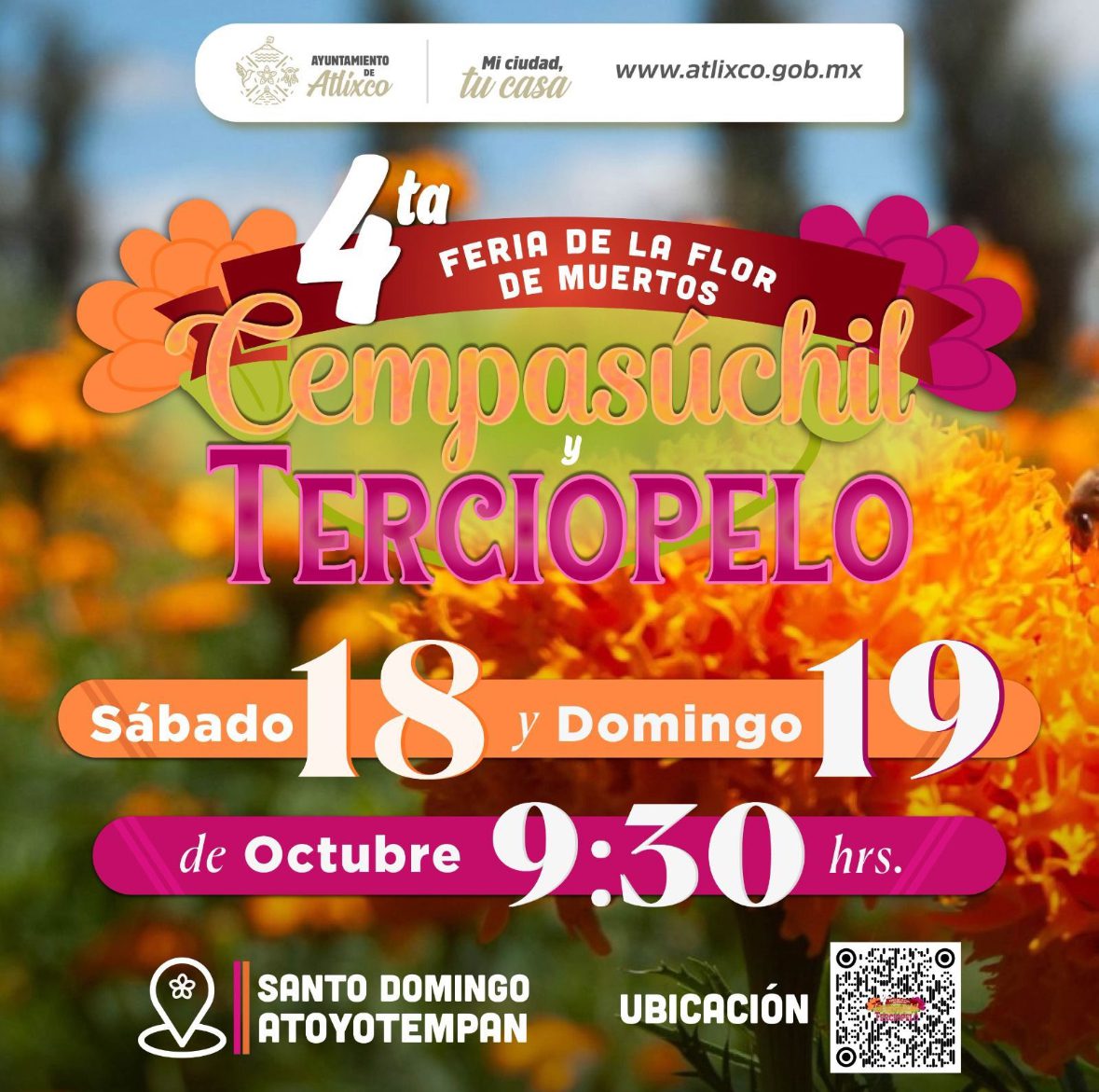 En Santo Domingo Atoyatempan, la 4ª Feria del Cempasúchil y el Terciopelo llenará de color los días 18 y 19 de octubre, con recorridos por los campos de flor, danzas folclóricas, muestras gastronómicas y el gran cierre musical del grupo Supremo.