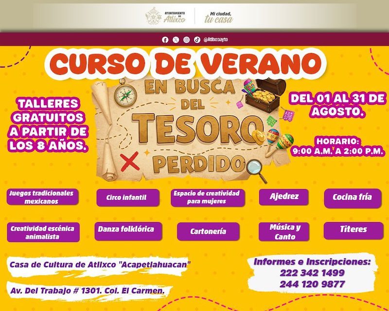 El curso es gratuito e incluye actividades como música, canto, danza folclórica, cocina fría, circo, títeres, cartonería y juegos tradicionales mexicanos.