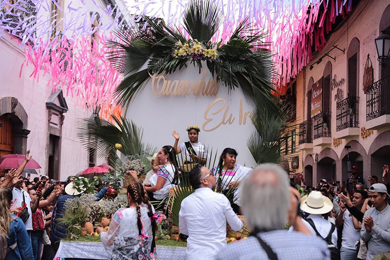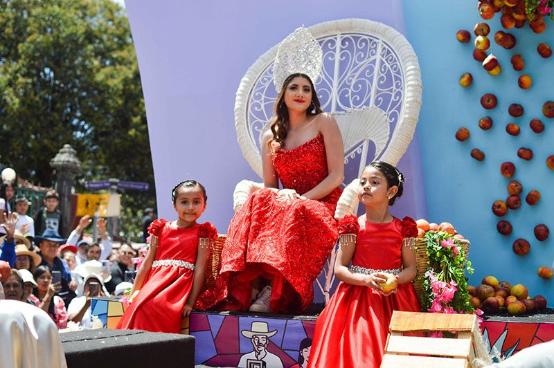 Este año desfilaron 40 carros alegóricos provenientes de juntas auxiliares, barrios, comunidades y asociaciones civiles. Todos ellos repartiendo manzanas a las y los asistentes.