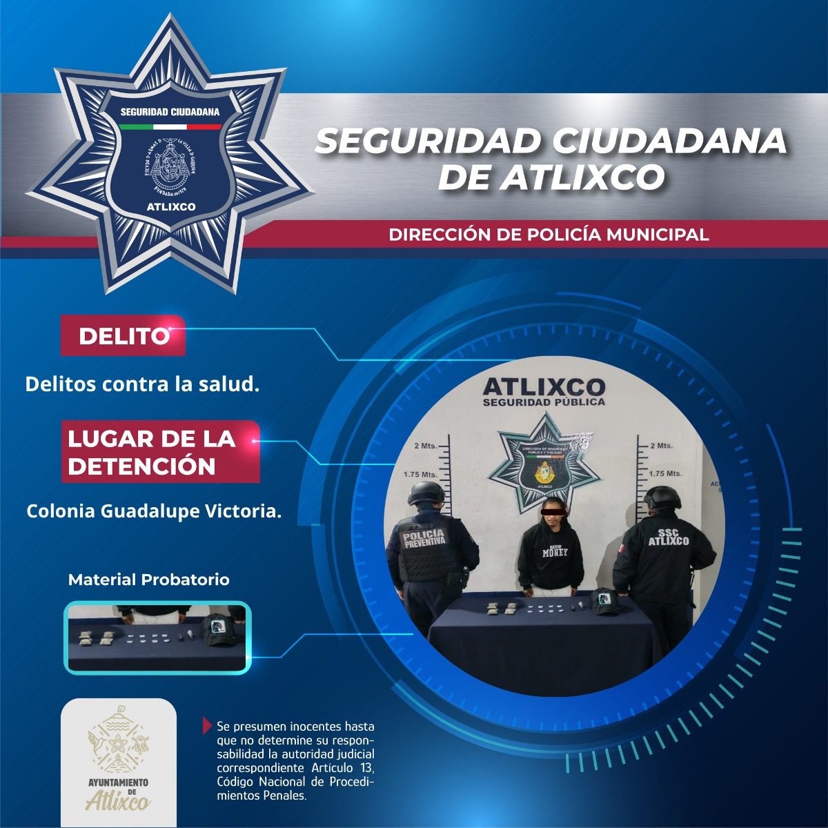 Como parte de las acciones permanentes de seguridad y vigilancia, elementos de la Secretaría de Seguridad Ciudadana de Atlixco realizaron la detención de un hombre en la colonia Guadalupe Victoria, por su factible participación en delitos contra la salud.