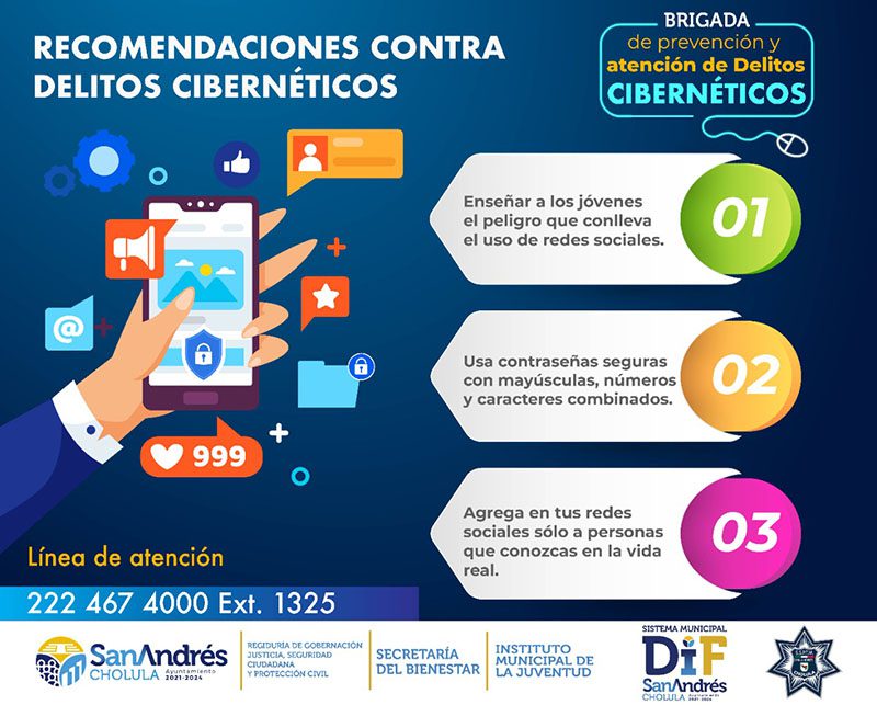 La Secretaría de Seguridad Pública y Protección Ciudadana (SSPPC) de San Andrés Cholula, en coordinación con la Regiduría de Gobernación, Jusiticia, Seguridad Ciudadana y Protección Civil, a través de la Brigada de Prevención y Atención de Delitos Cibernéticos y la Policía Cibernética, dieron a conocer una serie de recomendaciones con el objetivo de evitar que la ciudadanía sea víctima de robo de información o suplantación de identidad digital, las cuales se enlistan a continuación: